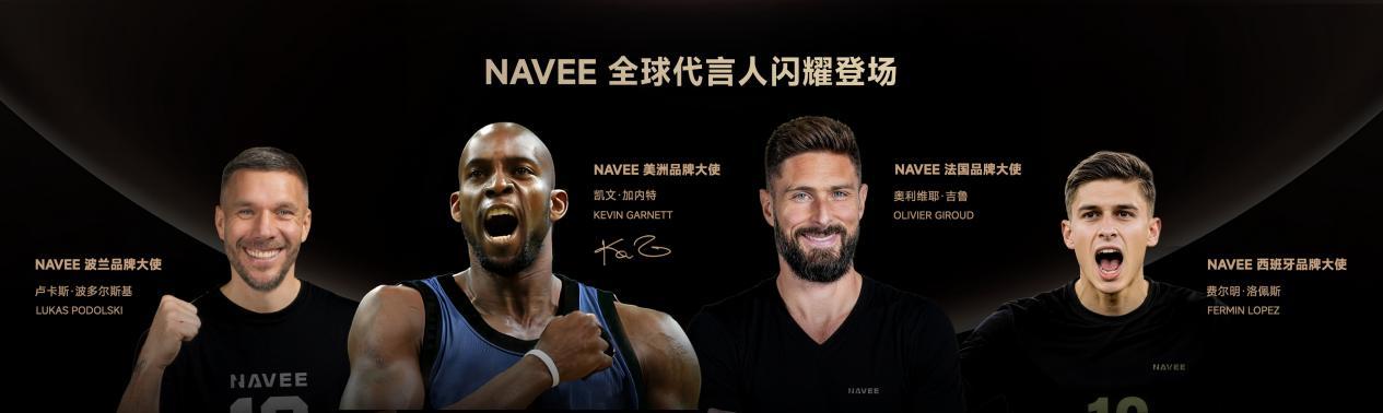 發佈會上,NAVEE正式公佈全球品牌代言陣容,包括籃球名人堂成員凱文·加內特(KevinGarnett)、法國足球傳奇奧利維耶·吉魯(OlivierGiroud)、西班牙足球新星費爾明·洛佩斯(FermínLópez)以及德國球星盧卡斯·波多爾斯基(LukasPodolski)。