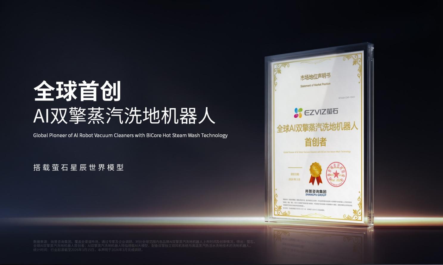 作爲首次佈局蒸汽洗地機器人賽道的品牌,螢石Stella星辰系列定位高端清潔旗艦,憑藉全球首創的雙擎雙熱活水洗地方案,獲得尚普諮詢頒發的“全球AI雙擎蒸汽洗地機器人首創”市場地位聲明,彰顯領先技術實力。