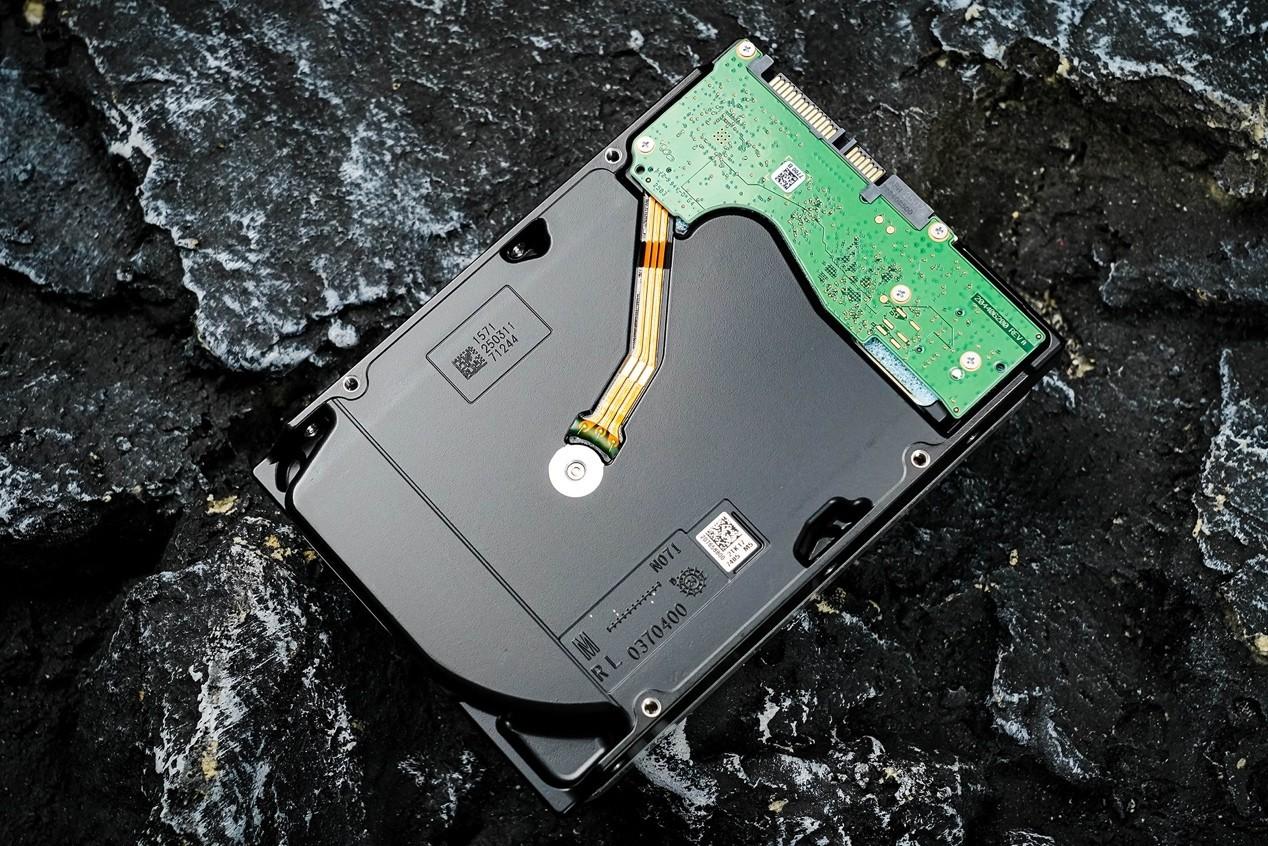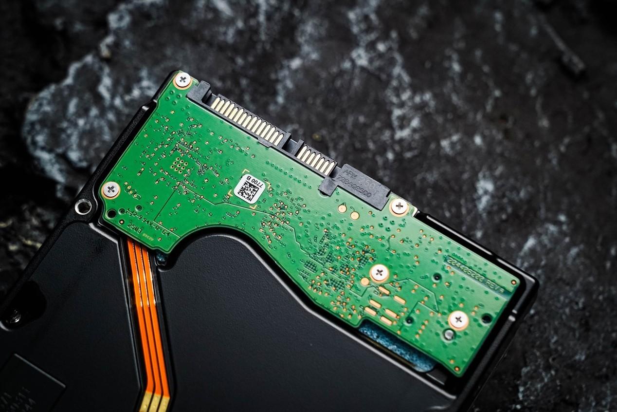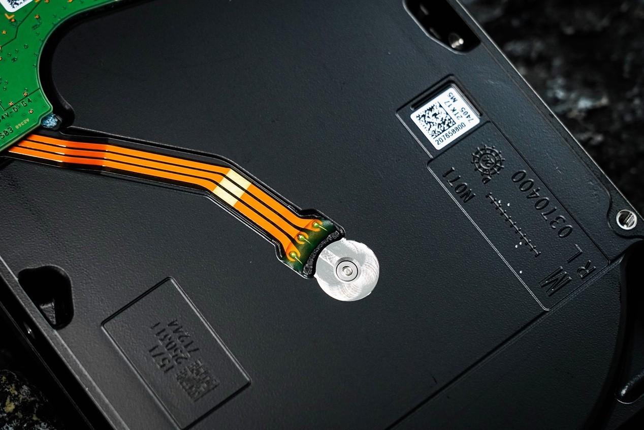 從背面看,希捷銀河Exos32TB的PCB採用倒裝式設計,所有的元件都在佈置在另一側,不直接外露更加安全,避免元器件磕碰掉落和短路風險,並能防止灰塵聚集。