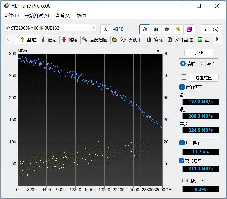在硬盤測試軟件HD Tune Pro的基準測試中,希捷銀河Exos 32TB的順序讀取速度曲線整體表現穩定,沒有出現大幅的尖峯和低谷,讀取速度最大爲289.3MB/s,最小爲129MB/s,平均速度爲225.9MB/s,平均訪問時間僅爲5.14ms。