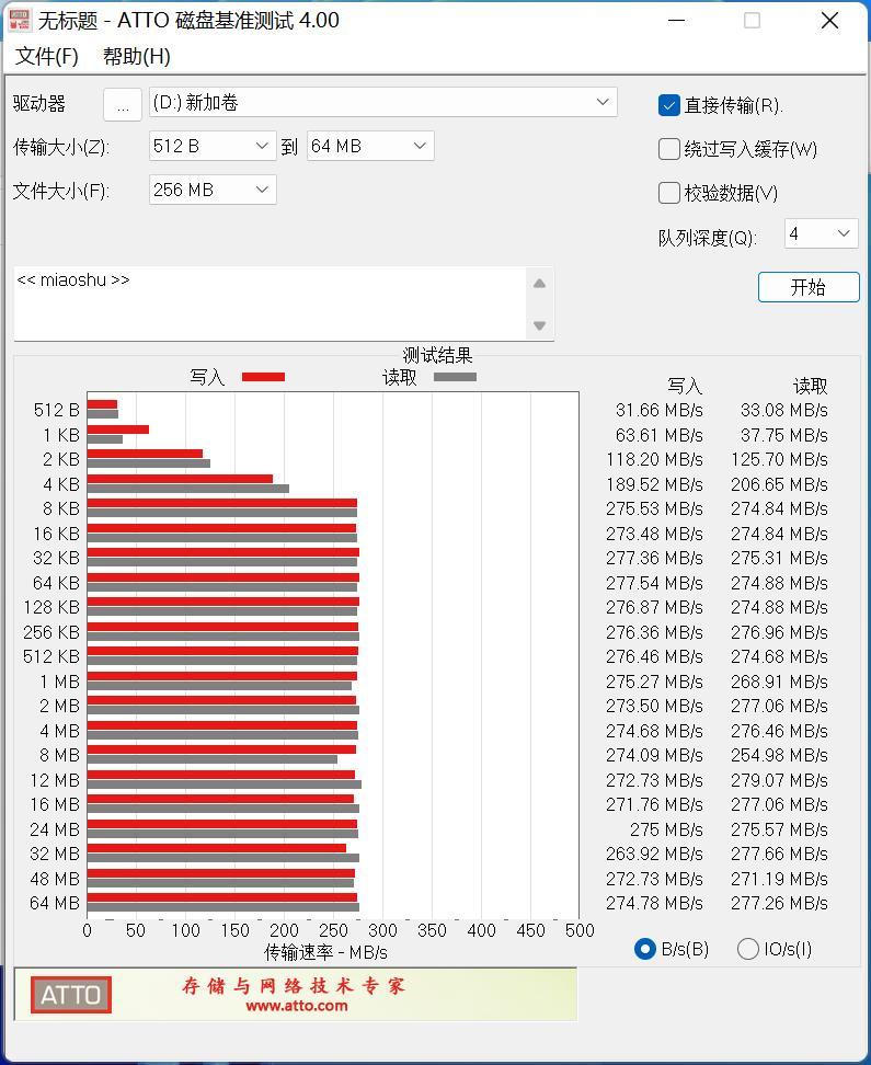 在ATTO磁盤測試結果顯示,希捷銀河Exos 32TB的4KB的文件讀寫速度分別達到了206MB/s和189MB/s;從8KB開始讀寫速度穩定均在274MB/s以上。