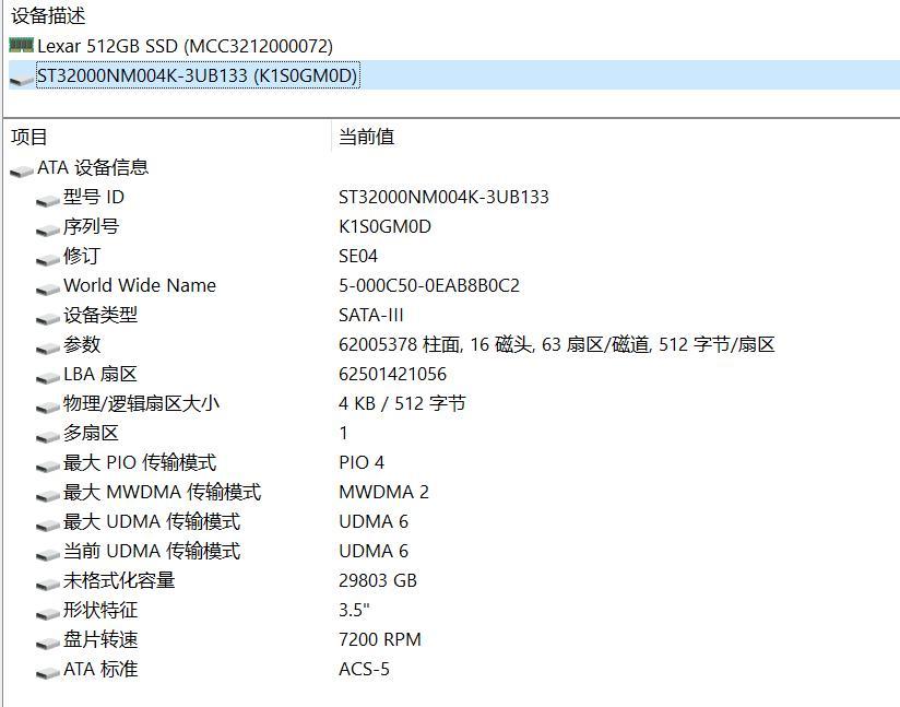 AIDA64的ATA信息顯示,希捷銀河Exos32TB配備16個磁頭,對應8個盤片。但這個識別結果並不準確,因爲希捷Mozaic(魔彩盒)平臺實現了單碟容量3TB,因此配備的是10個盤片和20個磁頭。