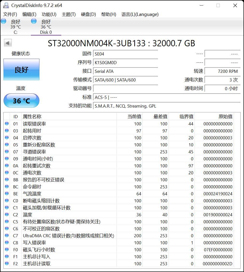 我們先看下希捷銀河Exos 32TB的基準信息,Crystal Disk Info顯示實際容量爲32000.7GB,採用SATA接口和SATA/600傳輸模式,轉速7200RPM,支持S.M.A.R.T、NCQ、Streaming、GPL功能,25℃室溫下閒時溫度36℃。