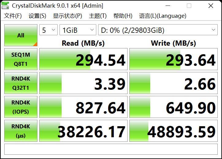 先看Crystal Disk Mark的測試,設備類型選擇默認和1GiB數據塊,希捷銀河Exos 32TB的8隊列1線程最大順序讀寫速度達到了294.54MB/s和293.64MB/s;4K隨機性能峯值高達827.64IOPS和649.9IOPS,性能非常強大。