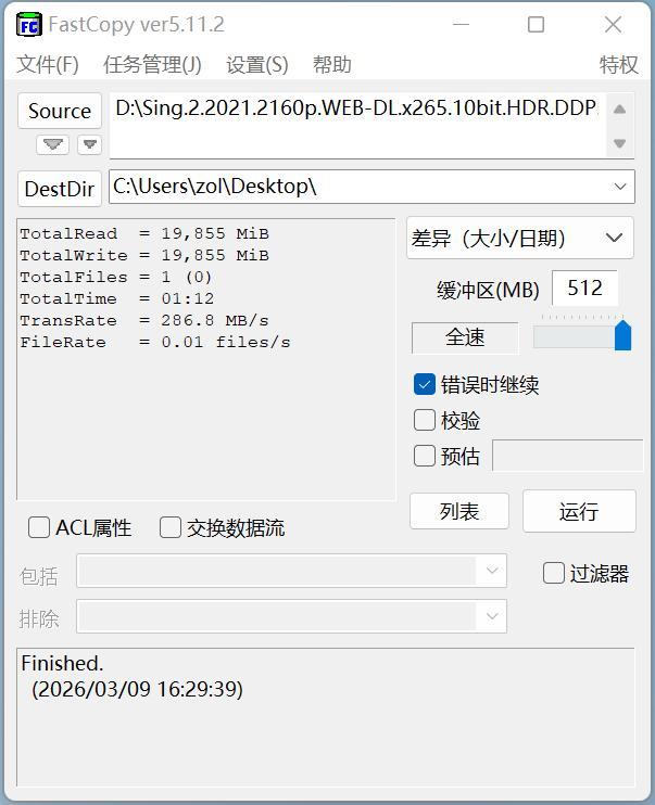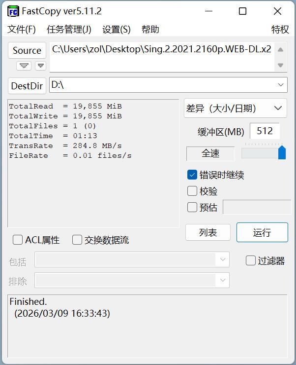 文件傳輸測試可以直觀體現硬盤的連續讀寫性能,使用FastCopy拷貝一部20GB的藍光電影,從電腦桌面(固態硬盤)傳輸到希捷銀河Exos 32TB用時僅爲1分13秒,傳輸速率高達284.8MB/s。