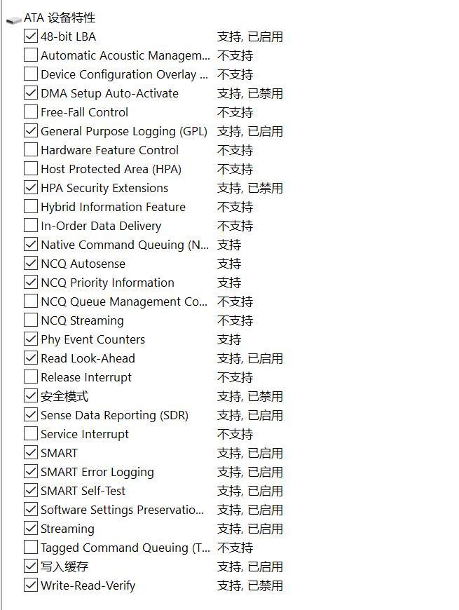 除此之外,AIDA64還顯示支持48位尋址、安全模式、SMART和NCQ等諸多特性。