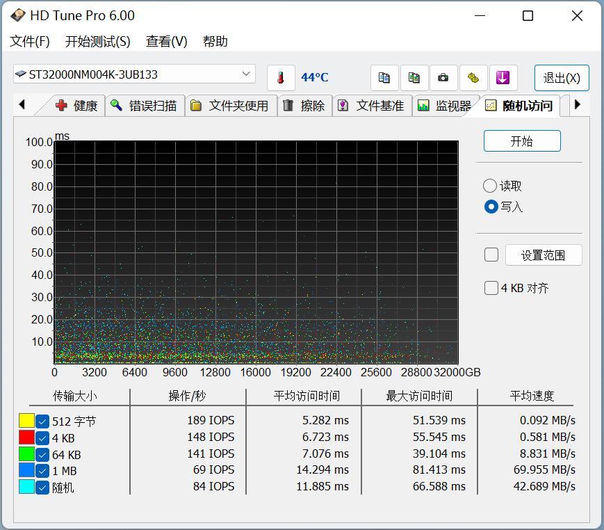 接下來是隨機訪問性能測試,希捷銀河Exos32TB隨機讀取速度平均值爲35.074MB/s,隨機吞吐量爲69IOPS。