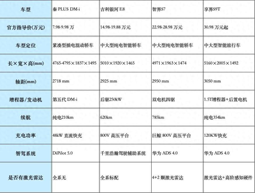 從十萬級親民混動到三十萬級高端純電,上述四款車型覆蓋不同預算區間,將實用的動力續航與前沿的智能配置深度融合,解決了消費者的補能焦慮、用車成本與出行體驗等核心需求。消費者可根據自身預算、日常出行場景做出選擇,注重性價比與家用實用選秦 PLUS DM-i,追求年輕潮流與城市智能出行選吉利銀河 E8,偏愛科技體驗與長途駕駛選智界 S7,注重豪華質感與多元出行選充電享界 S9T,精準匹配方能找到最適合自己的出行夥伴。