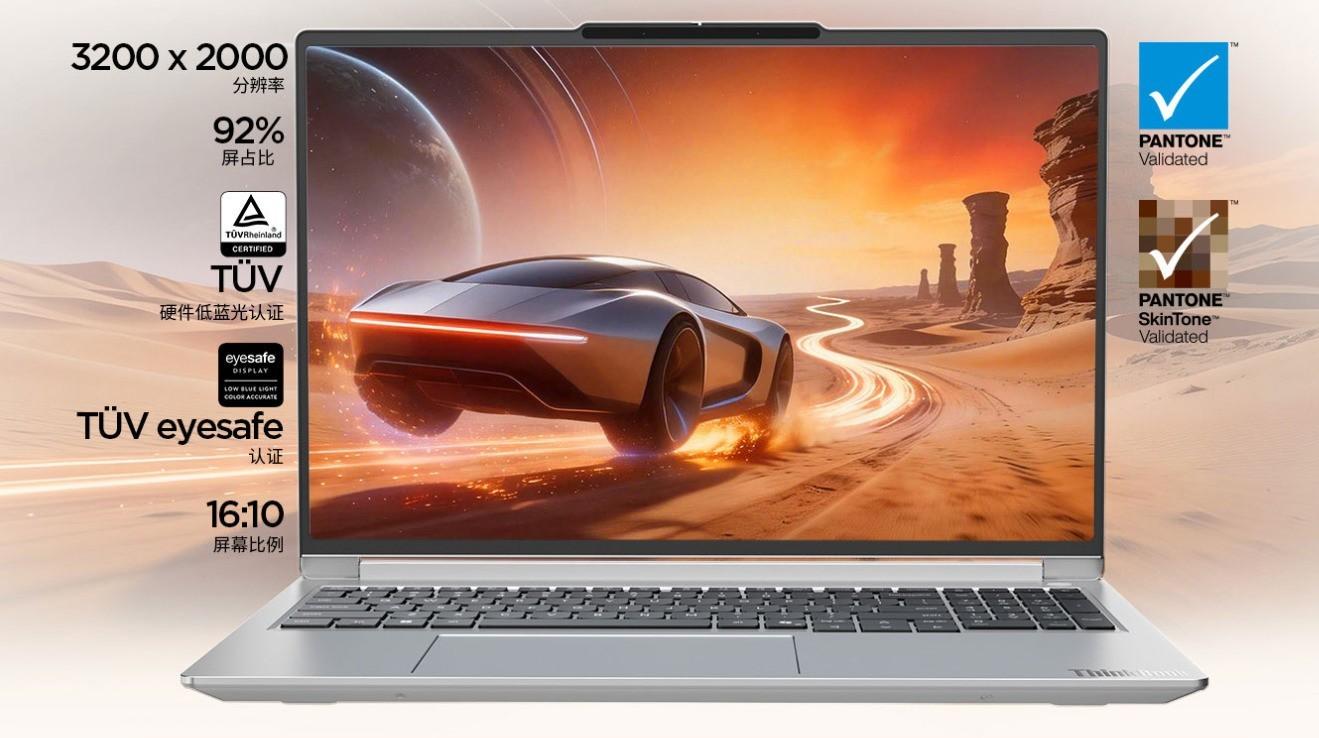 對於辦公用戶來說,大屏可以帶來更好的視覺體驗。一屏內顯示的信息更多,避免了頻繁滾動翻頁的麻煩。ThinkBook 16+ 2026配備16英寸微邊框全面屏,四邊超窄邊框設計使其屏佔比高達92%,觀看屏幕時有一種撲面而來的沉浸感。同時其屏幕採用了3.2K超高清分辨率(3200×2000),支持165Hz刷新率,通過了萊茵硬件級低藍光認證和eyesafe護眼認證,並且通過了Pantone色彩認證,長時間用眼損害降低的同時,確保了精準的色彩表現。