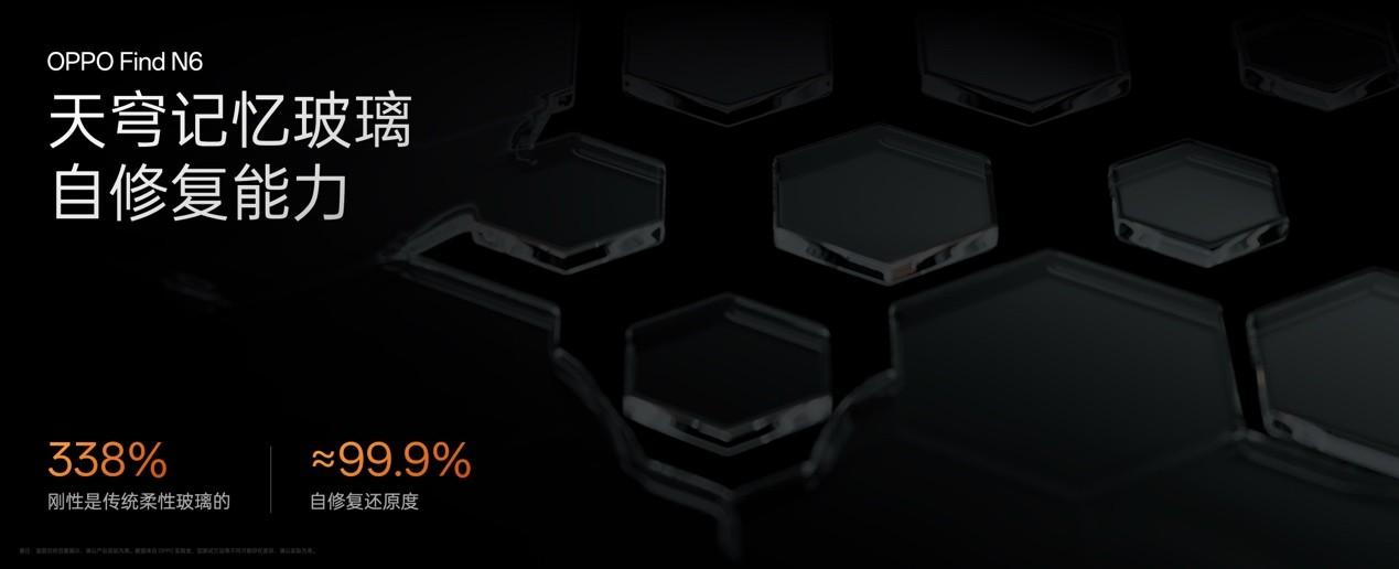 在屏幕層面,針對柔性玻璃因過度追求“柔”而導致的不可逆形變問題,OPPO聯合三星顯示推出了“天穹記憶玻璃”。該玻璃強化層相對前代提升至148%,抗彎曲形變能力提升至338%,其核心在於引入了“記憶恢復”機制,具備超高的自修復還原度,即便經歷反覆彎折,摺痕也能像記憶枕頭一樣悄然恢復平整,實現久折不彎,拒絕永久形變。