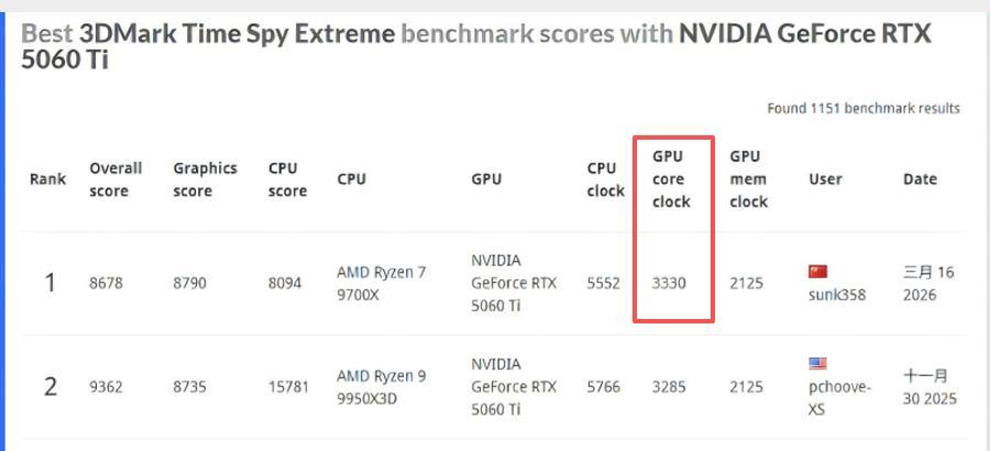 與此同時,技嘉在甜品級市場也有亮眼表現。技嘉RTX5060 Ti 8G魔鷹顯卡憑藉卓越的超頻潛力,在3DMarkTime Spy Extreme基準測試中核心頻率突破至3.33GHz,展現出強勁的超頻能力。