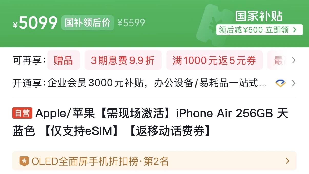 2026年3月,蘋果iPhone Air迎來新一輪價格跳水,這款首發7999元的超薄旗艦,在中國移動京東自營店疊加國補後僅需5099元即可入手,較原價直降2900元,且取消地區限制,所有國補覆蓋區域均可享受該價格,創下上市以來新低。