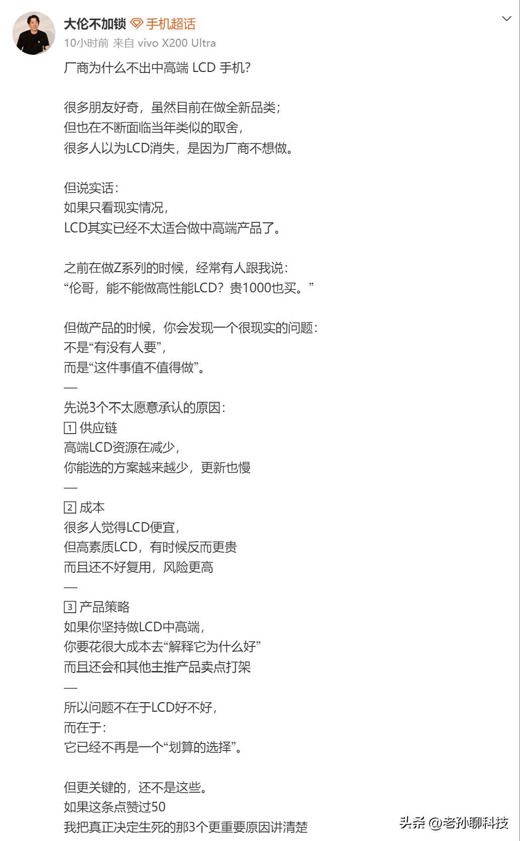 另一個原因當然是價格,只要廠商願意花大價錢,要求廠商開闢一條產線生產LCD屏幕,其實對於全球供應鏈不是難事。只是價格遠高於現成的OLED屏幕,同樣的配置,LCD屏幕價格比友商要貴出許多,出貨量不大的前提下,甚至一臺手機要高出上千元。廠商憑什麼單獨定製?畢竟“LCD黨”是少數人,雖然在網上可以掀起巨大的風浪,真正面對大衆市場時沒人會關心什麼屏幕。