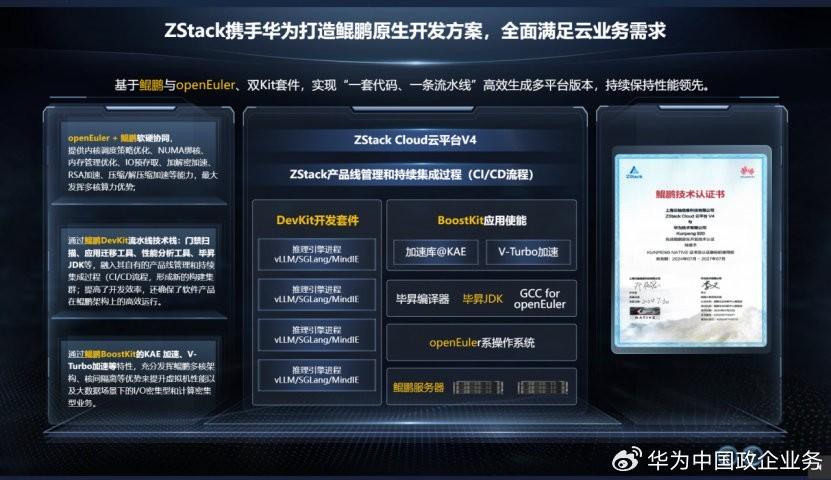 華爲通過鯤鵬、昇騰等核心能力,爲合作伙伴提供堅實的技術底座,共同打造面向千行百業的企業級解決方案,以穩定可靠的算力支撐與性能優化,加速行業數字化轉型進程。ZStack攜手華爲,基於鯤鵬與openEuler、雙Kit套件打造端側開發方案。該方案通過軟硬協同發揮多核算力優勢,藉助鯤鵬DevKit流水線技術棧提升開發效率,依託鯤鵬BoostKit的加速特性全面優化整體性能,通過開發提效、多核算力與性能躍升滿足雲業務需求。