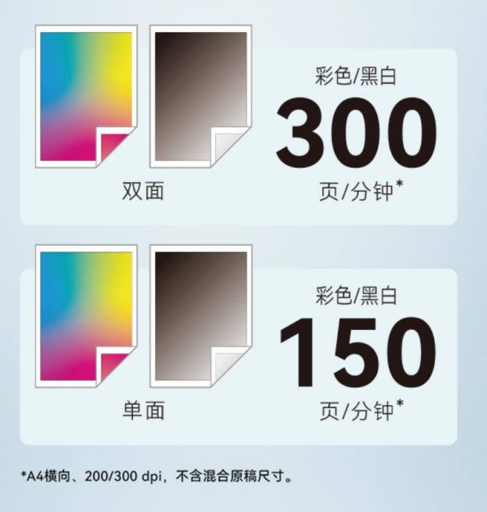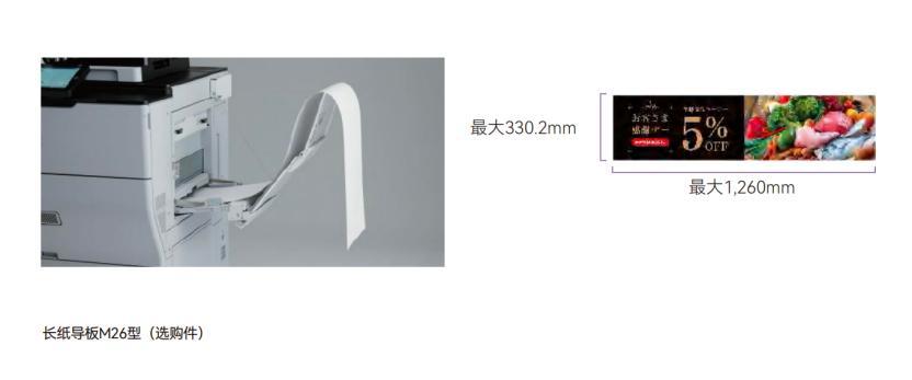 在進紙方面,設備最大進紙容量可達8,100頁,搭配旁路大容量紙盒,顯著減少頻繁添紙的麻煩。設備可自動切換裝有同規格紙張的其他紙盒,確保輸出任務連續不間斷。打印分辨率高達4,800dpix1,200dpi,實現精細圖像輸出,提升全綵作品的細節表現力與色彩層次感,輕鬆勝任營銷海報等打印任務。此外,設備標準配備長尺寸印刷功能,支持1,260mm超長打印,可輸出長幅POP、展會橫幅等營銷物料,並支持直接從標準紙盒輸出明信片、信封等特殊紙張,提升日常辦公效率。