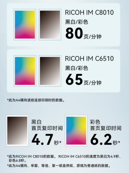理光A3彩色多功能數碼複合機IMC8010/C6510以高性能應對海量挑戰,以數智化賦能轉型之路,以匠心設計守護綠色地球,以全面安全體系築牢防線,助力企業邁向高效、智能、可持續的未來。