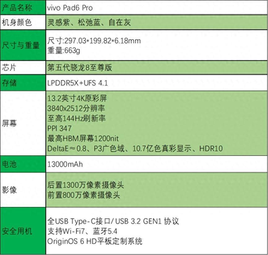 最後,我們再來看看vivo Pad6 Pro的其他配置。這塊平板重663g,厚6.18mm,有靈感紫、鬆弛藍、自在灰三種配色供用戶選擇,支持Wi-Fi 7、藍牙5.4,USB-C接口支持USB 3.2 GEN1協議。