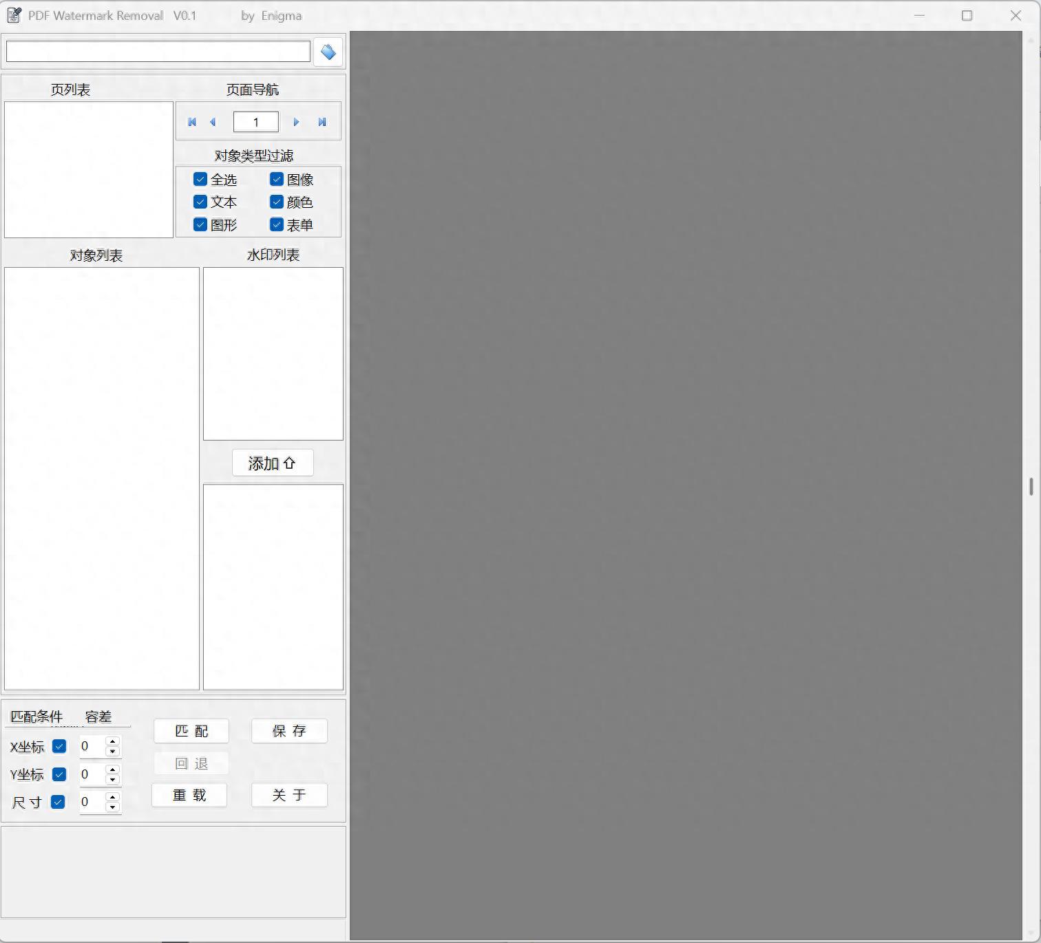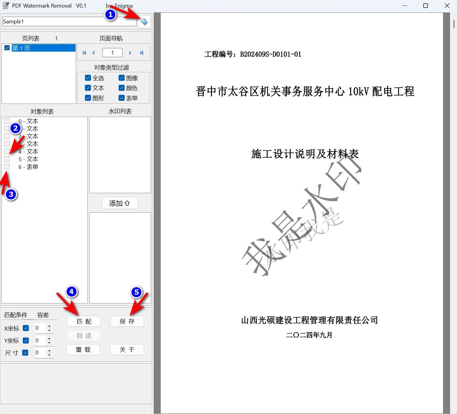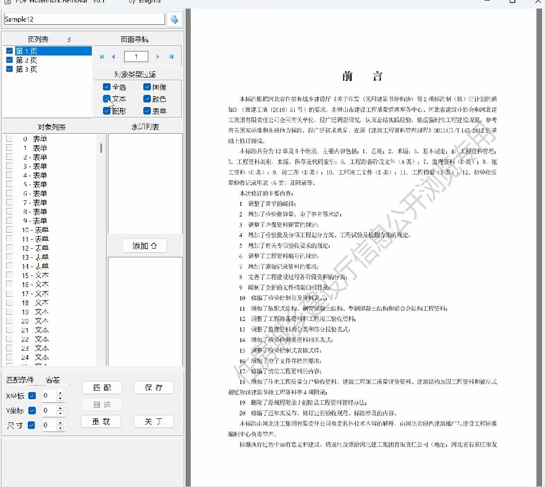 與傳統PDF編輯軟件複雜的圖層處理不同,PdfWatermarkRemoval採用"對象識別"技術。用戶只需導入文檔,在對象列表中勾選水印對應的文本或表單元素,點擊"匹配-保存"即可完成清理。實測顯示,無論是頁眉頁腳的文字水印,還是斜跨頁面的半透明標記,均可精準定位並批量移除。