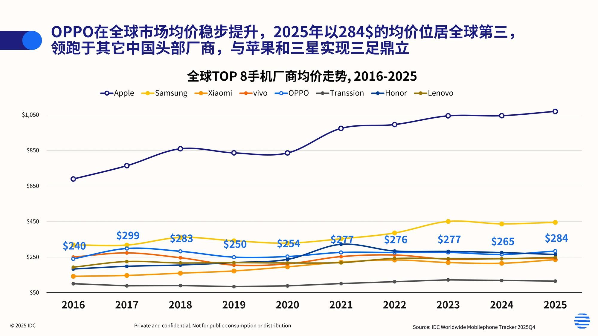 均價是衡量品牌高端化成色最直接的標尺。IDC數據顯示,2025年OPPO全球智能手機均價達284美元,在全球出貨量TOP8 廠商中僅次於蘋果與三星,位列第三,同時以顯著優勢領跑所有其他中國頭部手機品牌。