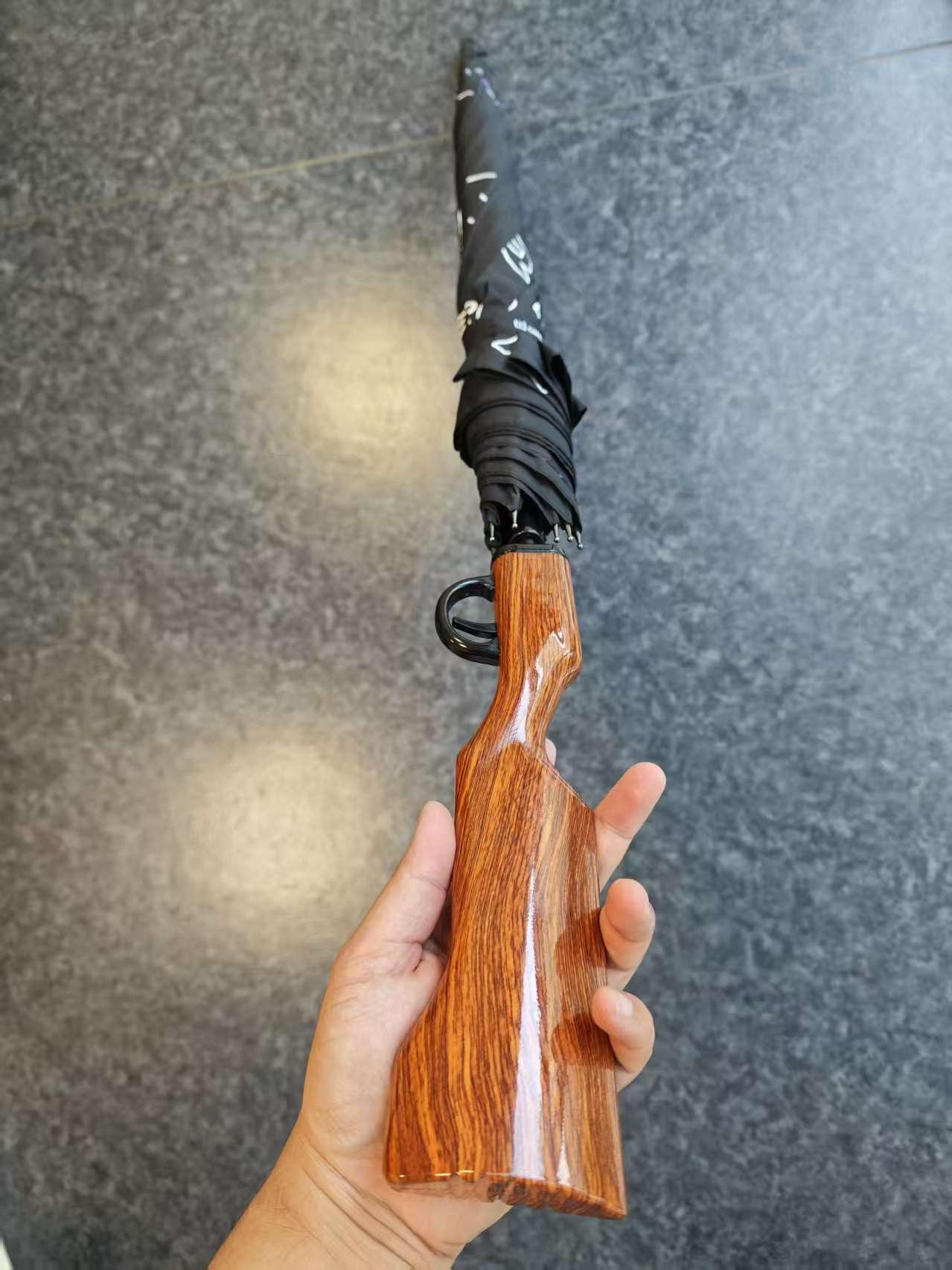 禮盒內僅有槍柄造型雨傘和“槍神執照”卡片兩件物品。這把雨傘徹底打破常規,外觀復刻復古步槍,仿木質握把握感溫潤,貼合手掌工學,沉甸甸的質感十足。最亮眼的是握把下方的扳機,並非裝飾,扣動即可開傘,“開火”的儀式感拉滿。收起時是完整“長槍”,撐開則是實用的防風黑膠傘,兼顧趣味與實用,每處細節都緊扣射擊主題。