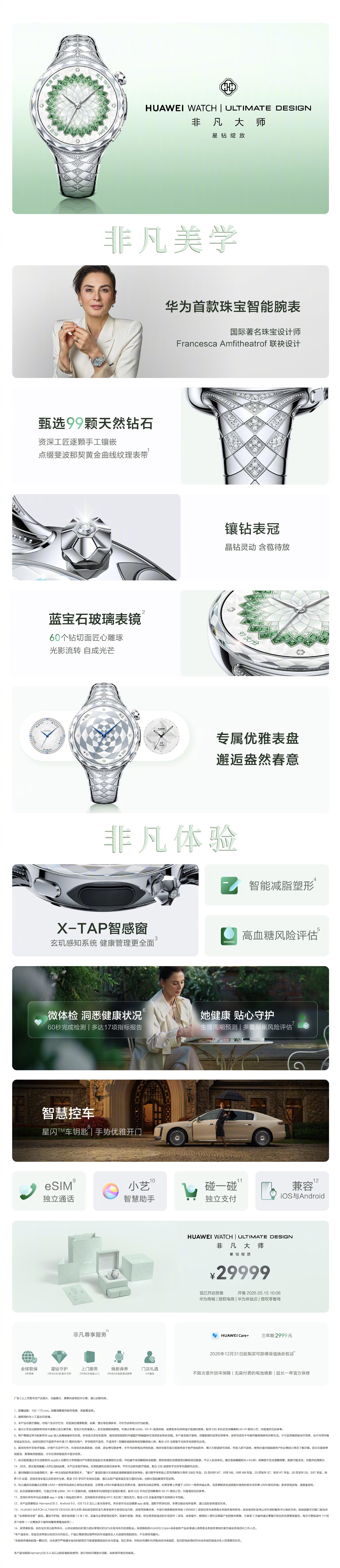 華爲 WATCH | ULTIMATE DESIGN 非凡大師「星鑽綻放」是華爲首款珠寶智能腕錶,由國際珠寶設計師 Francesca Amfitheatrof 聯袂打造。