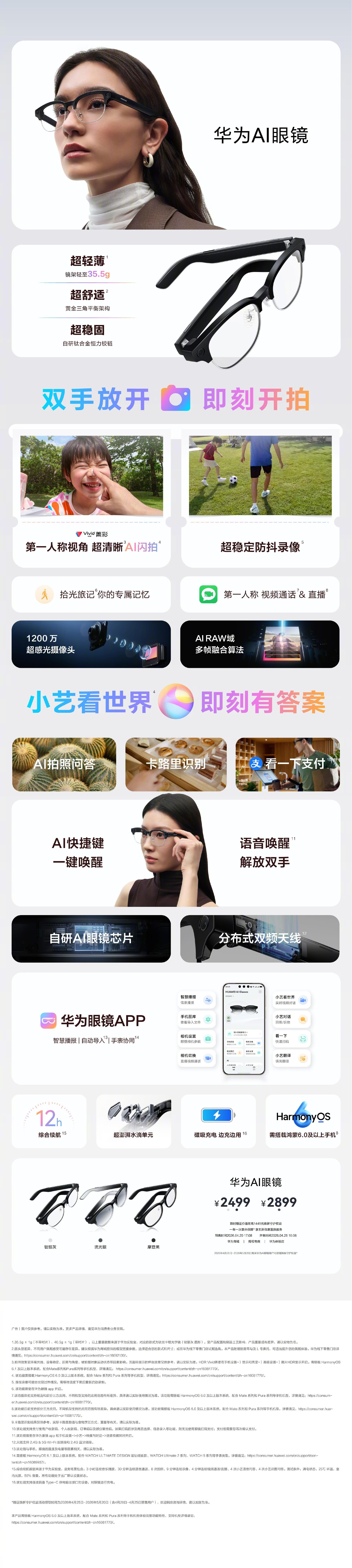 AI 交互體驗上,支持 AI 拍照問答、卡路里識別、“看一下” 支付等功能,可通過 AI 快捷鍵或語音喚醒小藝,解放雙手。硬件上搭載自研 AI 眼鏡芯片與分佈式雙頻天線,搭配超澎湃水滴單元音頻系統,帶來流暢交互與清晰音質。續航方面,支持磁吸充電邊充邊用,綜合續航可達 12 小時,搭配華爲眼鏡 APP,還可實現智慧播報、自動導入、手錶協同等功能,需搭載 HarmonyOS 6.0 及以上手機使用。