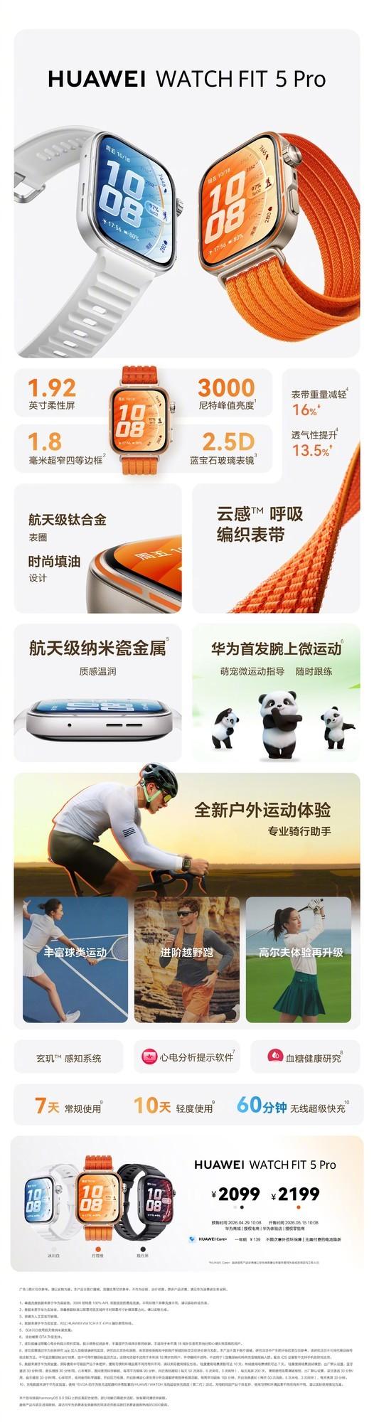 華爲 WATCH FIT 5 Pro 是 FIT 系列的高端進階款,主打專業運動與健康監測,兼具質感設計與全能體驗。外觀上,搭載 1.92 英寸柔性大屏,搭配 1.8 毫米超窄四等邊框、3000 尼特峯值亮度與 2.5D 藍寶石玻璃表鏡,顯示效果出衆。表圈採用航天級鈦合金材質,搭配航天級納米瓷金屬機身與雲感™呼吸編織錶帶,質感與佩戴舒適度全面升級。