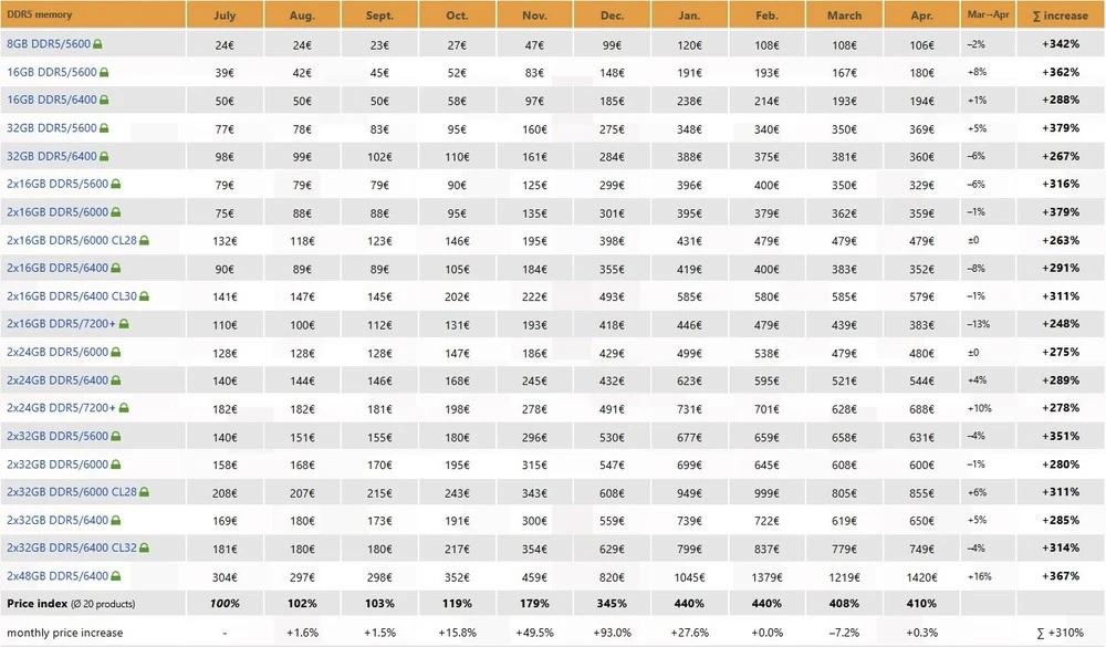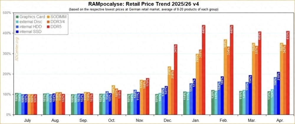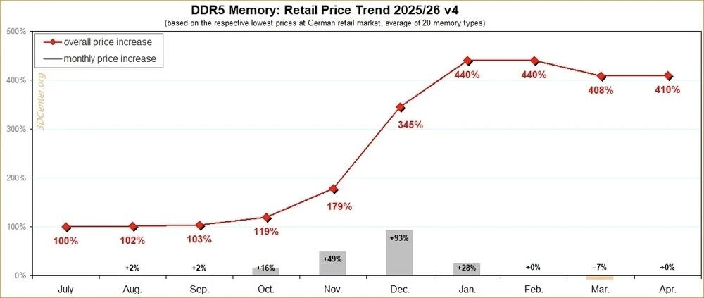 今年3月,持續飆漲的DDR5內存罕見出現7%回調,讓不少持幣觀望的裝機用戶以爲"春天來了"。然而德國硬件監測機構3DCenter最新發布的4月價格指數顯示,這波降價僅是曇花一現——DDR5均價已重新抬頭,較2025年7月基準價仍高出310%,穩居"存儲危機"風暴眼。