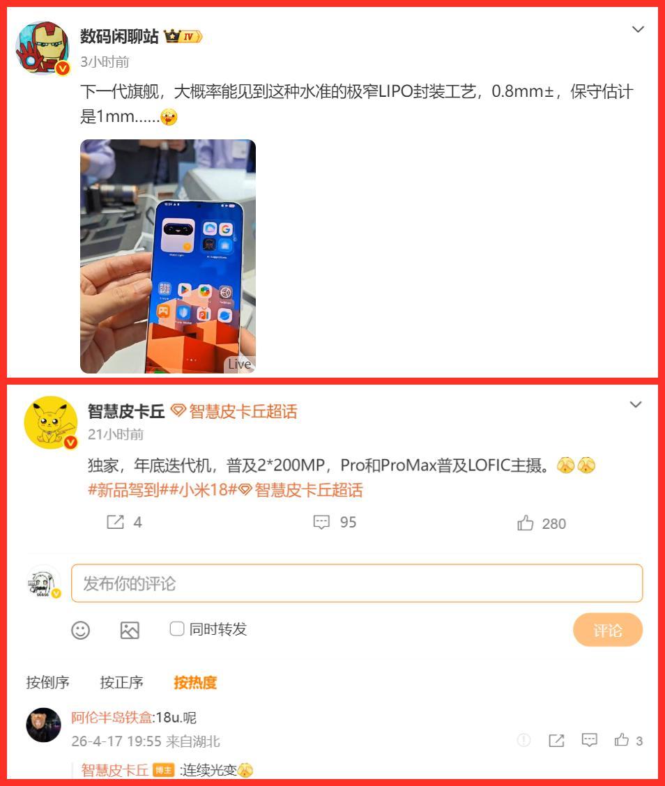 其實綜上信息來看,小米18系列將用全系2億像素打影像差異化,Pro/Pro Max上LOFIC主攝讓影像無懈可擊,LIPO極窄邊框拉滿視覺衝擊力。
