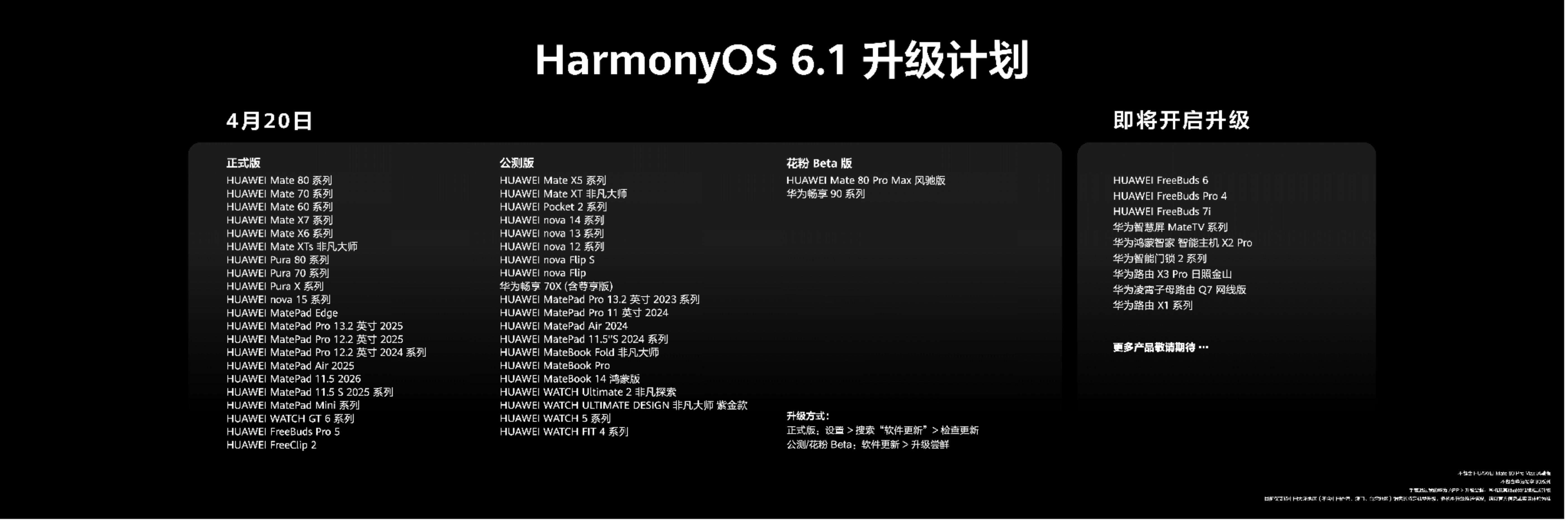 具體HarmonyOS 6.1適配機型涵蓋以下三大版本(各機型升級推送情況以官方實際體驗爲準):