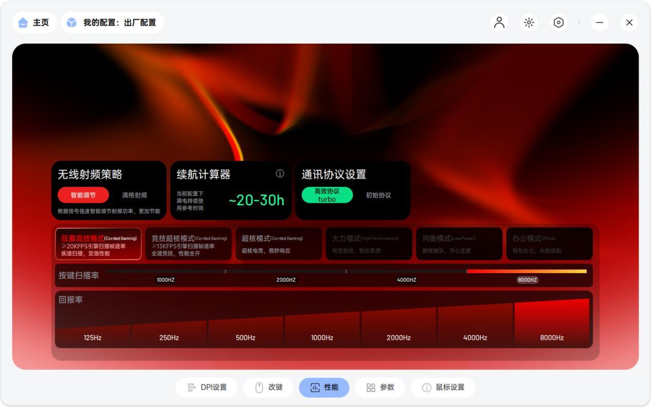 而使用1kHz常規電競參數時,200+小時的使用時間依舊可以算是長續航。這得益於Power+(代號:炎龍)技術對芯片等固件的調教。本次OTA更新後,新增的對於按鍵掃描率的調節選項,也讓玩家進一步增添了雷柏對全系產品持續升級自研固件,讓老用戶隨時有驚喜這一產品理念的瞭解。