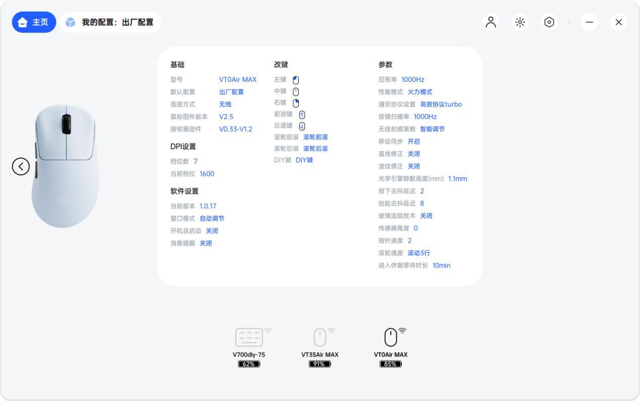 在C+click2.0保護型按鍵預壓技術的加持下,雷柏VT0/VT3s Air MAX的按鍵清脆手感和回彈體驗都乾淨利落,沒有空位、晃動、粘滯等不舒服的感覺。使用雷柏AHUB驅動可以檢查鼠標的各項詳細參數,對鼠標的性能和設置有更深入的瞭解,並做出個性化調試。