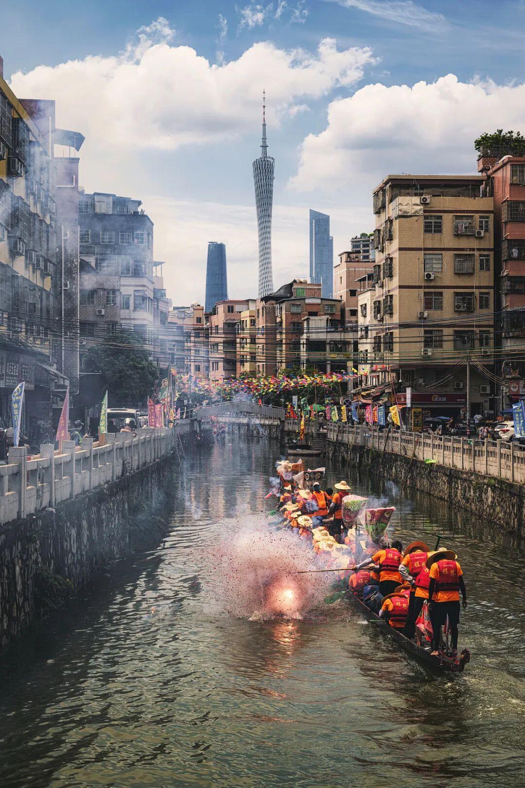 CBD前賽龍舟,這種傳統與現代的碰撞可太潮了。圖爲廣州大塘龍舟。