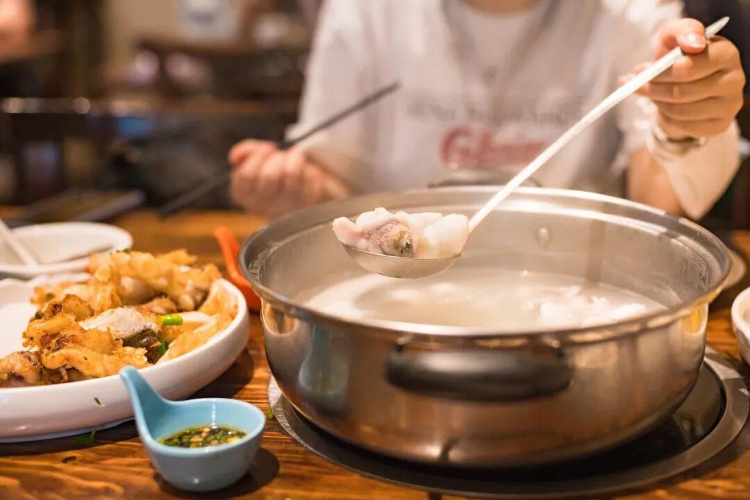 另一種喫魚方式,是被稱爲 “桑拿魚” 的蒸法:雞湯作底,時蔬托起魚片,利用蒸汽在最短時間把鮮味鎖住。魚肉嫩到彷彿入口即化,上桌蘸料即食,滿足老饕們對魚這種食材的所有幻想。