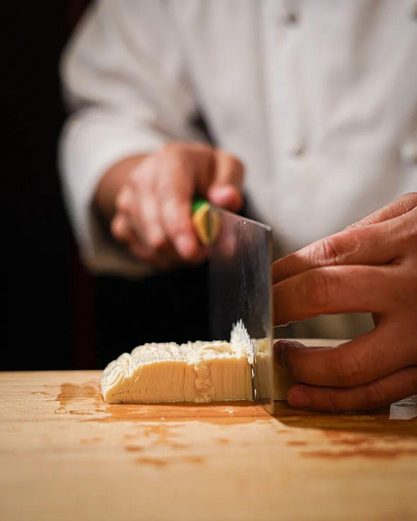 文思豆腐就是淮揚菜刀工登峯造極的體現:豆腐先切成薄片,再切成絲,絲細如髮,薄如蟬翼,放入湯中豆絲不斷。食進口中,入口即化,一塊再普通不過的豆腐在刀下便能成爲“纖鋒剖出玲瓏雪,薄質雕成宛轉絲”的美味。
