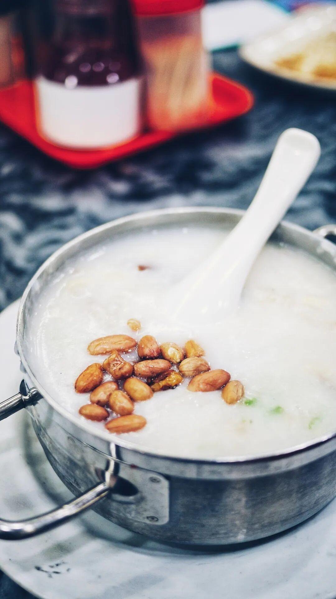 不同於“先煮材料再柴火熬粥”的方式,順德人喜歡在粥滾開的一刻,把切得薄如蟬翼的食材放進去,魚片、牛肉、或豬雜,在沸騰的粥水裏與米香相擁,柔軟而鮮美。魚片只需輕輕一涮便散發鮮香,豬雜在粥中被悄悄淨化,沒有腥氣,只有鮮甜。