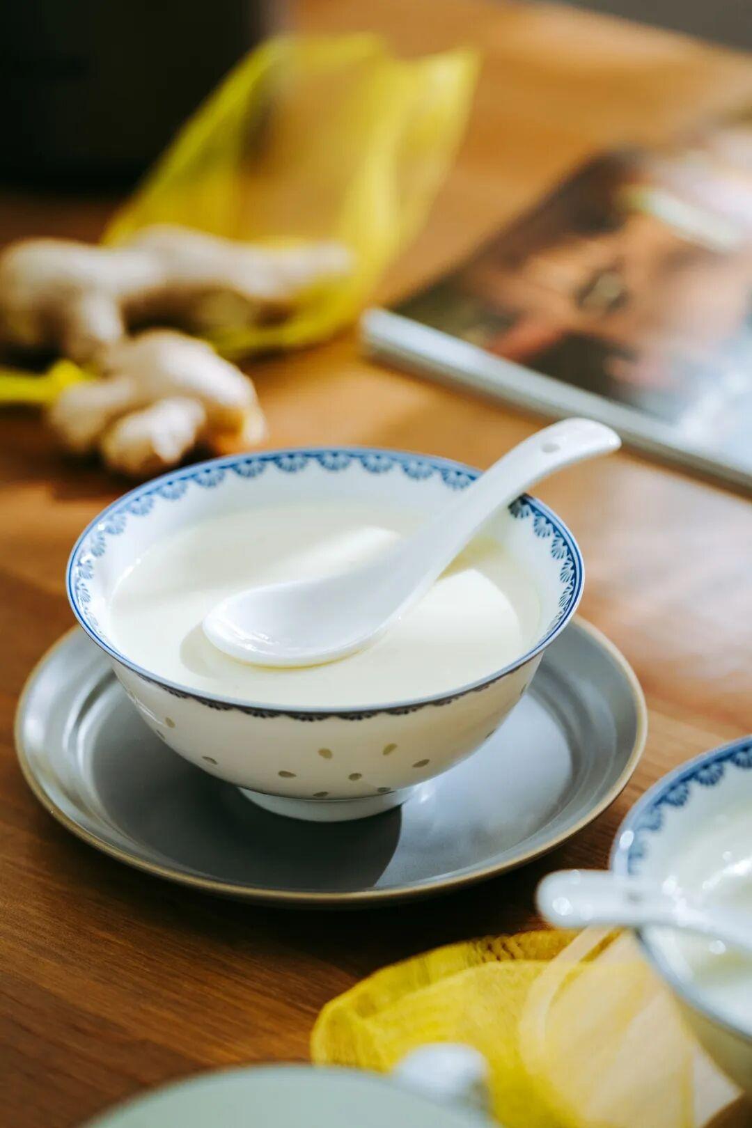姜撞奶則是順德氣質的另一面:熱奶被快速傾入盛着薑汁的碗裏,沒有攪動,沒有多餘動作,僅憑那一瞬間的力量與溫度,讓姜的辛香與奶的醇厚凝成一塊細膩如凝脂的嫩滑,這種風味帶有順德人的鮮明個性——柔中帶勁。