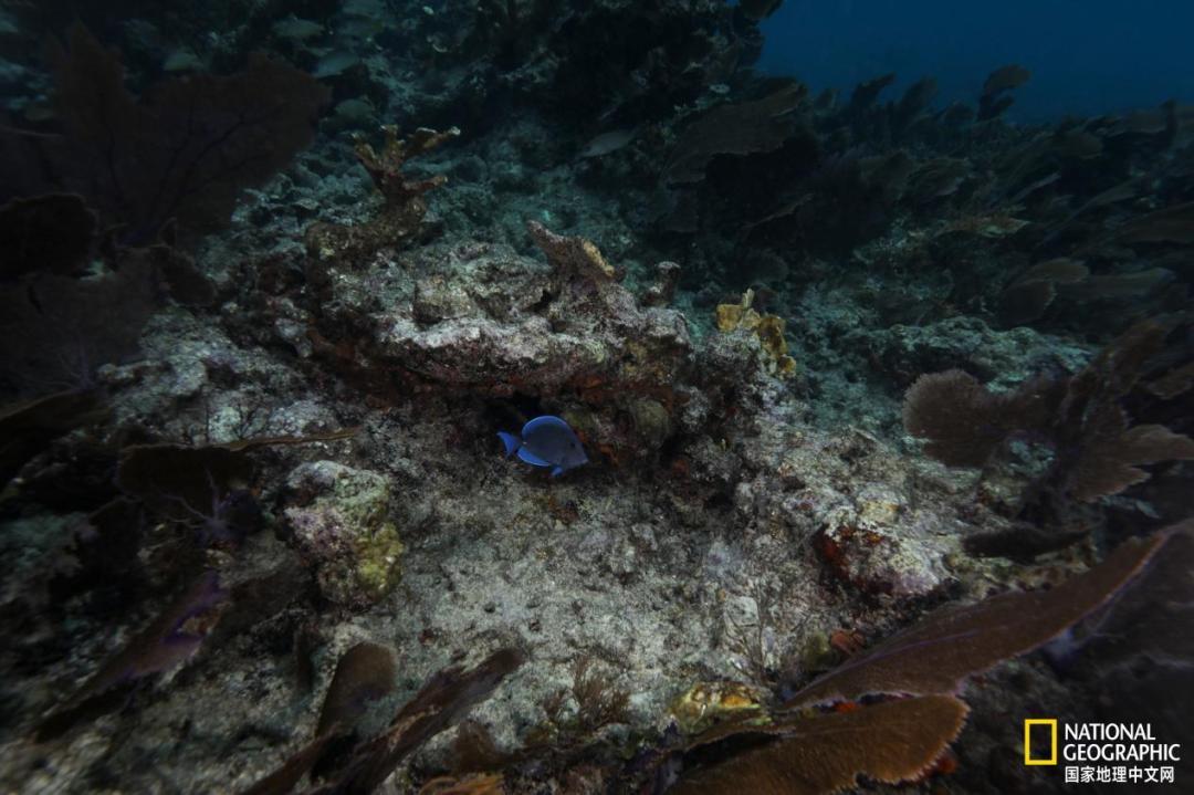 2023年11月29日,在美國佛羅里達州基拉戈島(Key Largo)附近一處名爲 “埃爾博礁”的海域,一條藍刺尾魚(blue tang fish)在珊瑚叢中穿梭。據一項新研究報告顯示,同年夏季發生的一場海洋熱浪,已導致佛羅里達州的兩種珊瑚物種陷入 “功能性滅絕” 狀態。|國家地理圖片集