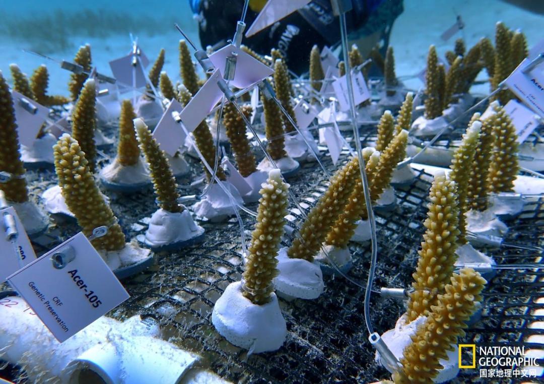 這些鹿角珊瑚幼體是從海洋培育場中取回的——此前海水溫度一度高達 32攝氏度以上,此舉是爲了確保它們能夠存活。而正是這一珊瑚物種,近日被宣佈處於 “功能性滅絕” 狀態,這意味着它們已無法在自然環境中有效生存。|國家地理圖片集
