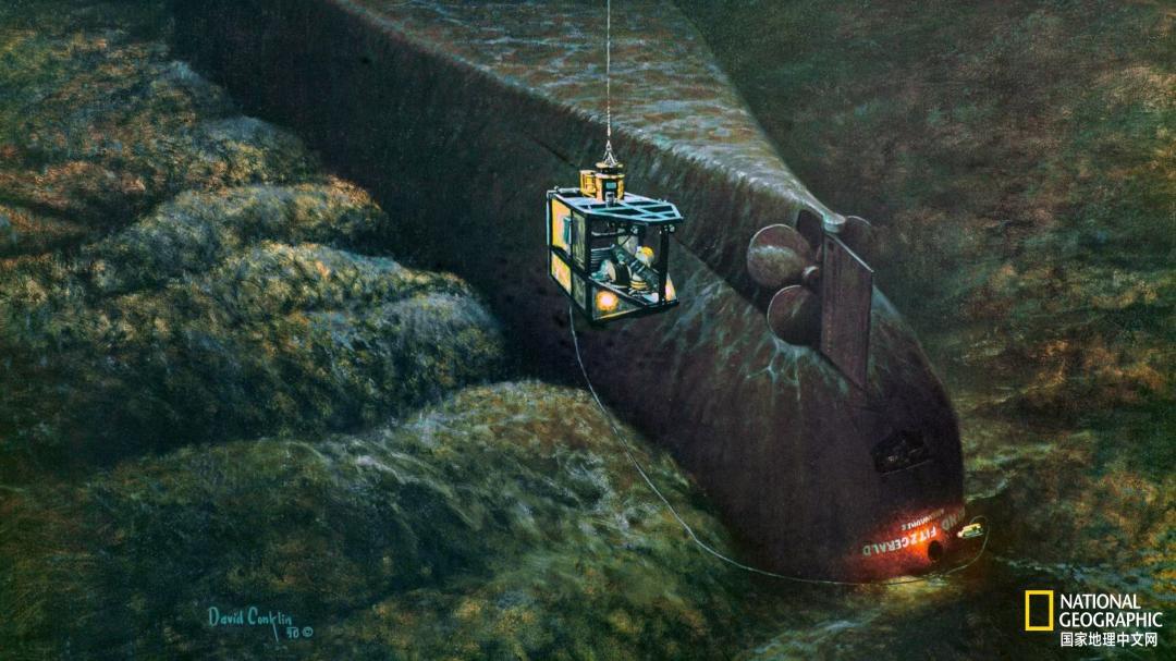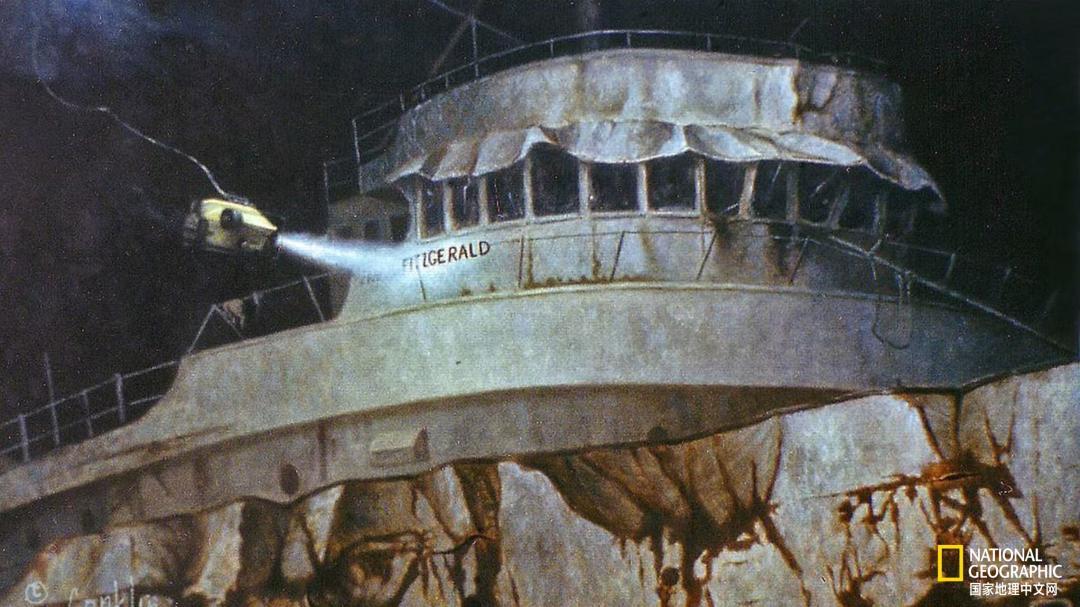 在五大湖沉船歷史協會委託創作的這幅畫作中,藝術家大衛・康克林描繪了對埃德蒙・菲茨傑拉德號殘骸的調查場景。調查人員試圖查明這艘最先進的船隻爲何會失事,並鎖定了幾個潛在原因。| 國家地理圖片集