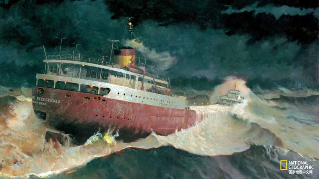 藝術家大衛・康克林(David Conklin)畫作《人人皆知》中,埃德蒙・菲茨傑拉德號蒸汽船(S.S. Edmund Fitzgerald)在蘇必利爾湖上那場註定悲劇的航行中,與洶湧的波濤奮力抗爭。該畫作旨在紀念這場悲慘海難的週年紀念日。| 國家地理圖片集