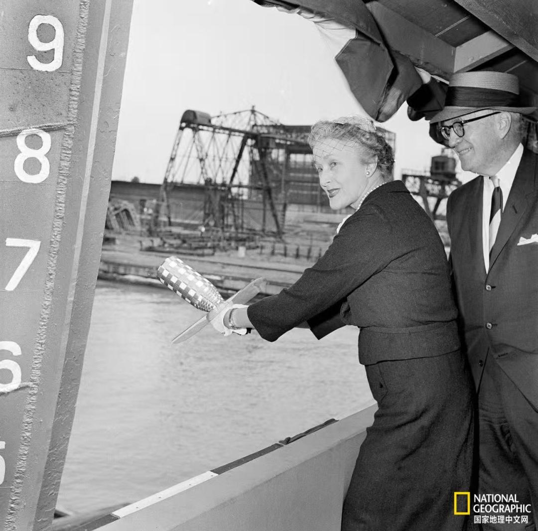 1958年6 月7日,西北互助人壽保險公司董事長的妻子伊麗莎白・菲茨傑拉德,在底特律手持一瓶香檳,爲埃德蒙・菲茨傑拉德號蒸汽船主持下水儀式。身旁陪同她的是她的丈夫,這艘船正是以他的名字命名的。| 國家地理圖片集