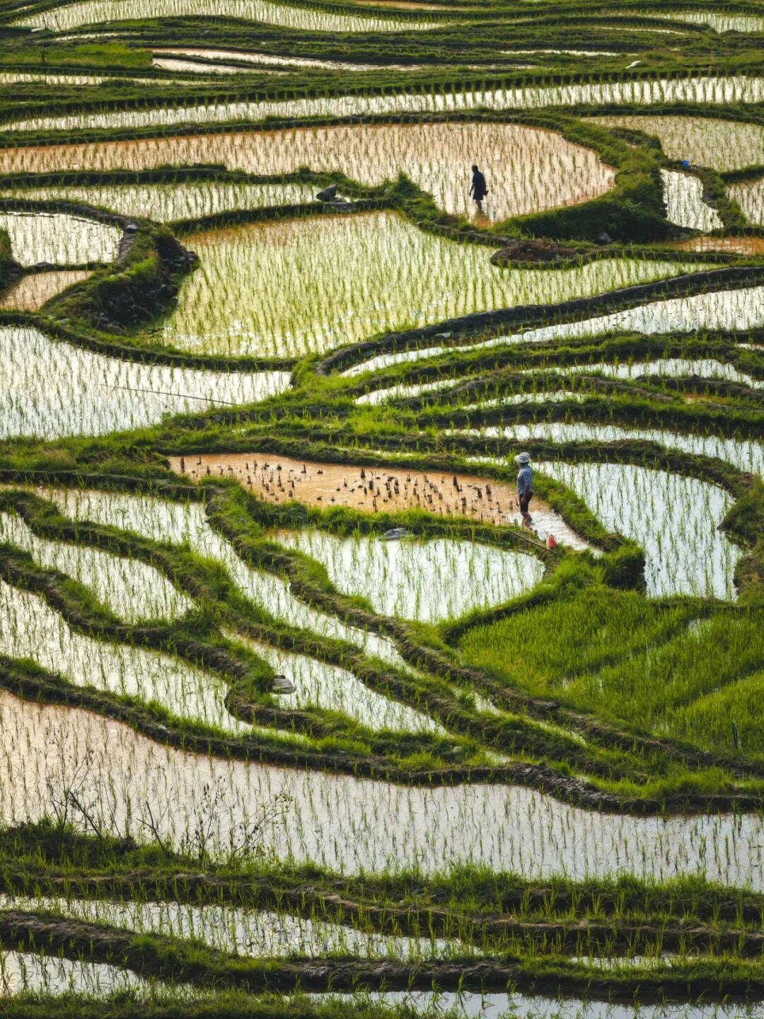 在地形起伏的地方,人們順應地勢,將水稻種在了梯田裏。