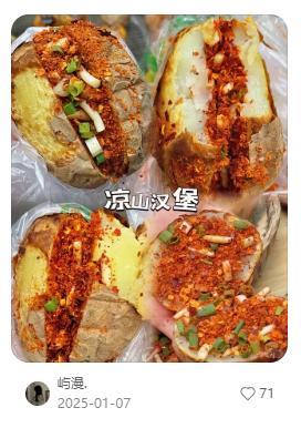 一路向南,來到四川涼山彝族自治州,有一種名爲“涼山漢堡”的新穎小喫。這道美食的做法頗爲簡單:將炭烤過的土豆從中間劃開但不切斷,然後填入蔥花、特製辣椒麪和折耳根,最後輕輕對摺,形似漢堡。