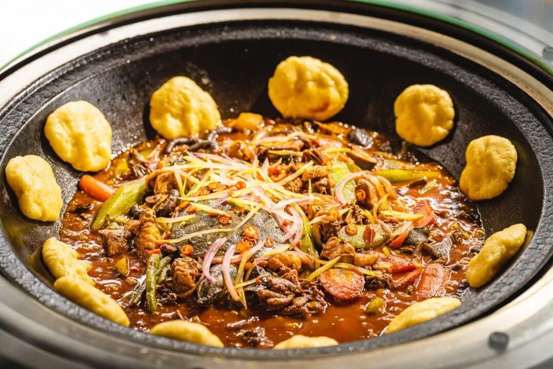 在東北,玉米被稱作"苞米",足以撐起一桌完整的"玉米宴"。鐵鍋燉是東北第一硬菜,鍋沿那一圈金黃的玉米麪貼餅子,纔是老喫家眼中真正的精華——貼着鍋的一面烙出焦香的脆殼,另一面吸飽了燉菜的湯汁,入口外脆內軟,滿口麥香。