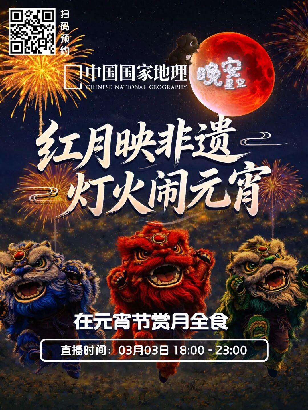 3月3日18:00,鎖定中國國家地理直播間,地理君陪你全程追賞月全食。同時,鏡頭不僅對準天穹奇觀,還將帶你共覽福建武夷山舞龍、廣東梅州埔寨火龍、江西婺源板凳龍燈、四川自貢燈會,邂逅內蒙古鄂爾多斯無人機焰火——以天景合人文,共赴這場上元團圓之約。