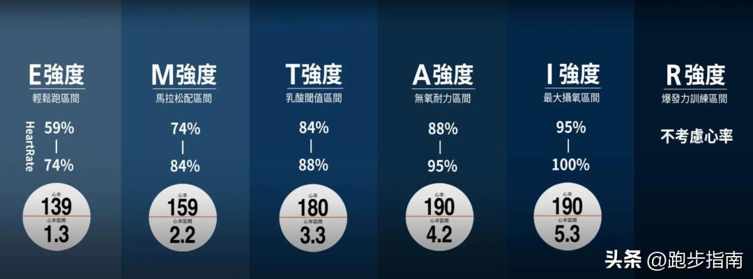 跑步強度在很大程度上決定了跑步訓練的效果,而心率則是判斷跑步強度的重要指標。通常將跑步強度分爲E、M、T、A、I和R六個級別。