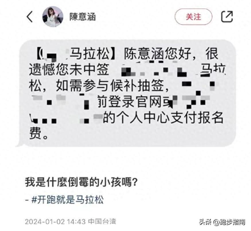 近日,陳意涵在社交平臺上發佈了一條信息,並配了一張馬拉松未中籤的信息短信。她感嘆道:“我是什麼倒黴的小孩嗎?”