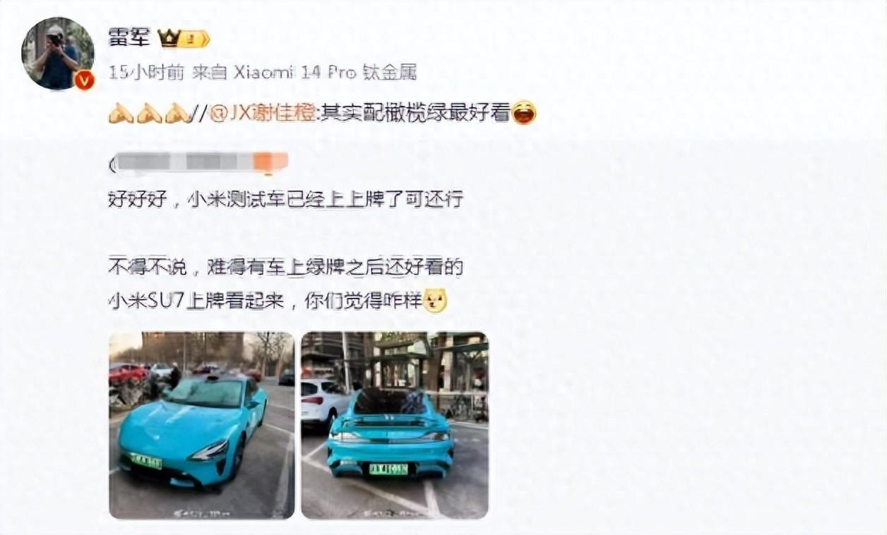 來自每日經濟新聞的一篇文章說:近日,一名博主發佈兩張小米SU7上牌後的實車照片,並表示:小米SU7測試車已經上牌了。隨後,雷軍也轉發了該微博,並透露小米SU7正在測試上牌流程。