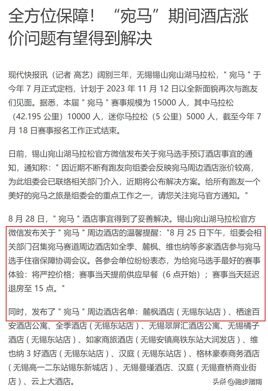 比如,去年的無錫錫山宛山湖馬拉松,組委會相關部門召集宛馬賽道周邊多家酒店參與宛馬選手住宿保障協調會議。